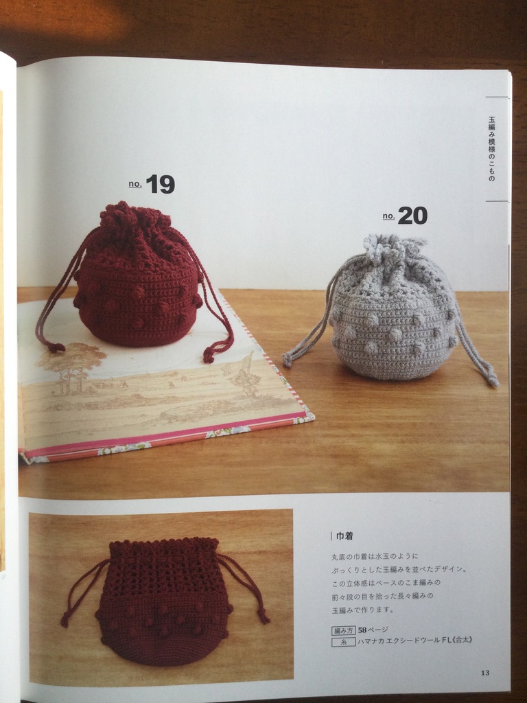 この本は、かぎ針編みを始めた時に本屋さんで見て一目惚れした本で、掲載されている作品が可愛過ぎて、思わず購入してしまったんです。作品毎に色々な編み方を用いていて、一冊持っているだけで模様編みがいくつも習得できてしまう優れ物なのである。