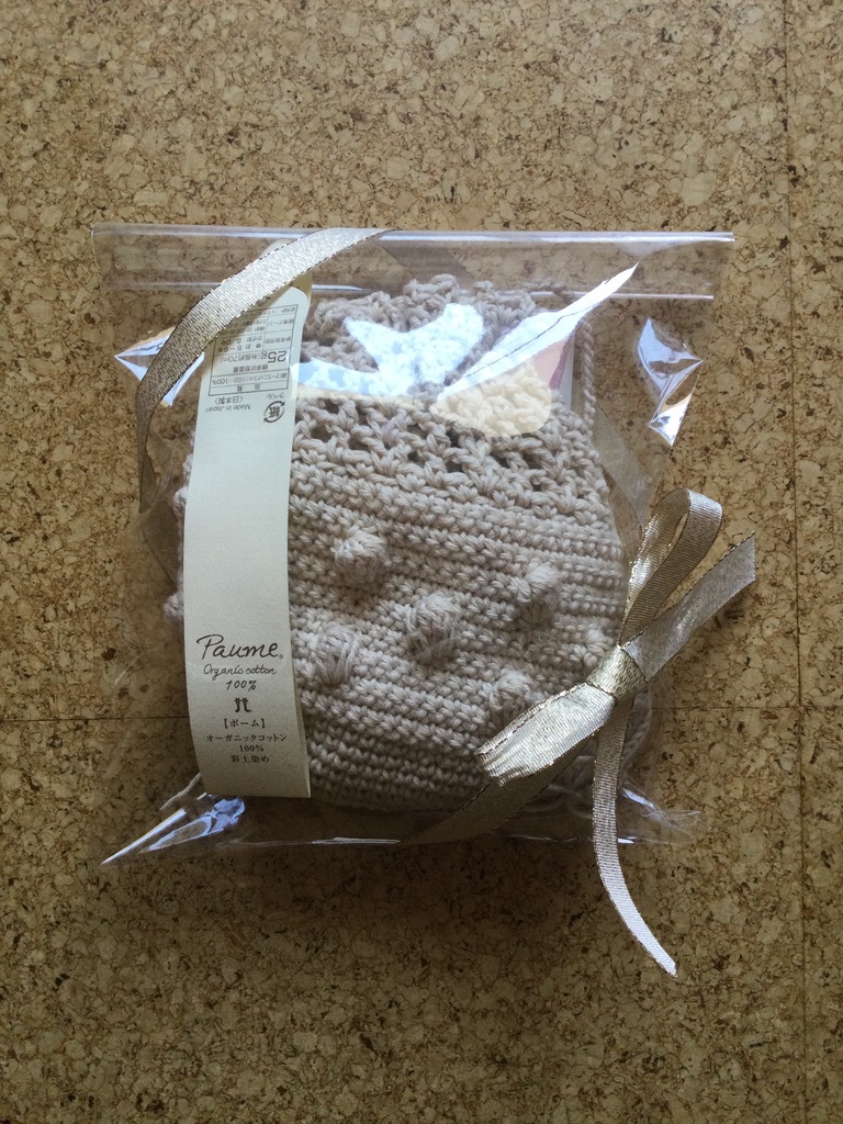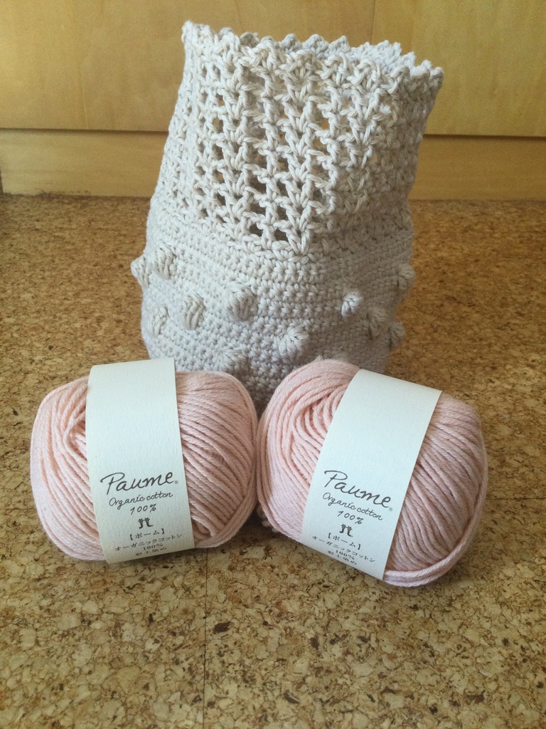 このオーガニックコットンの編み糸「Paume(ポーム)」は手芸店で見つけて、オーガニックコットンであることとその色味の柔らかさから、いつかこの糸で小物を作って見たいと思っていた。