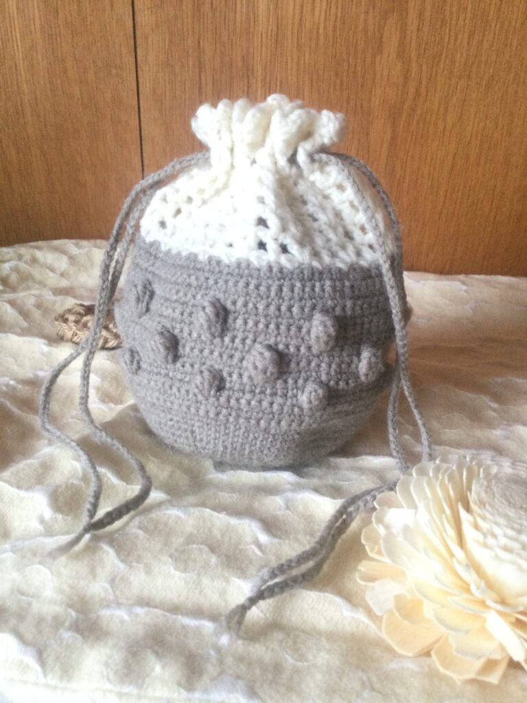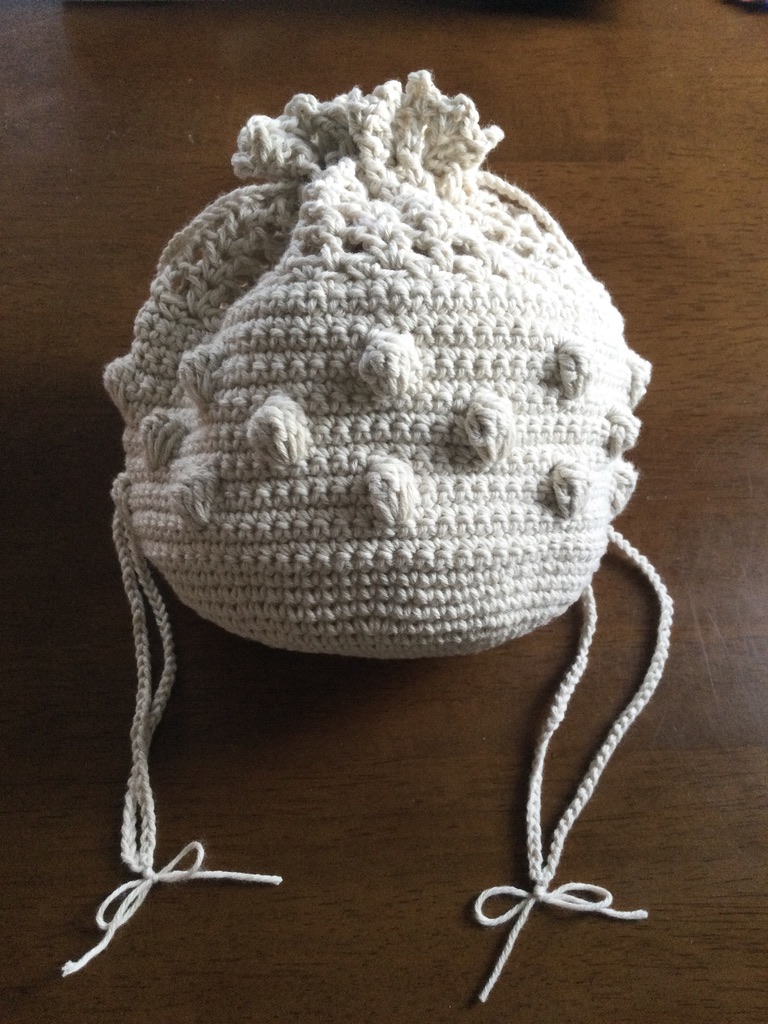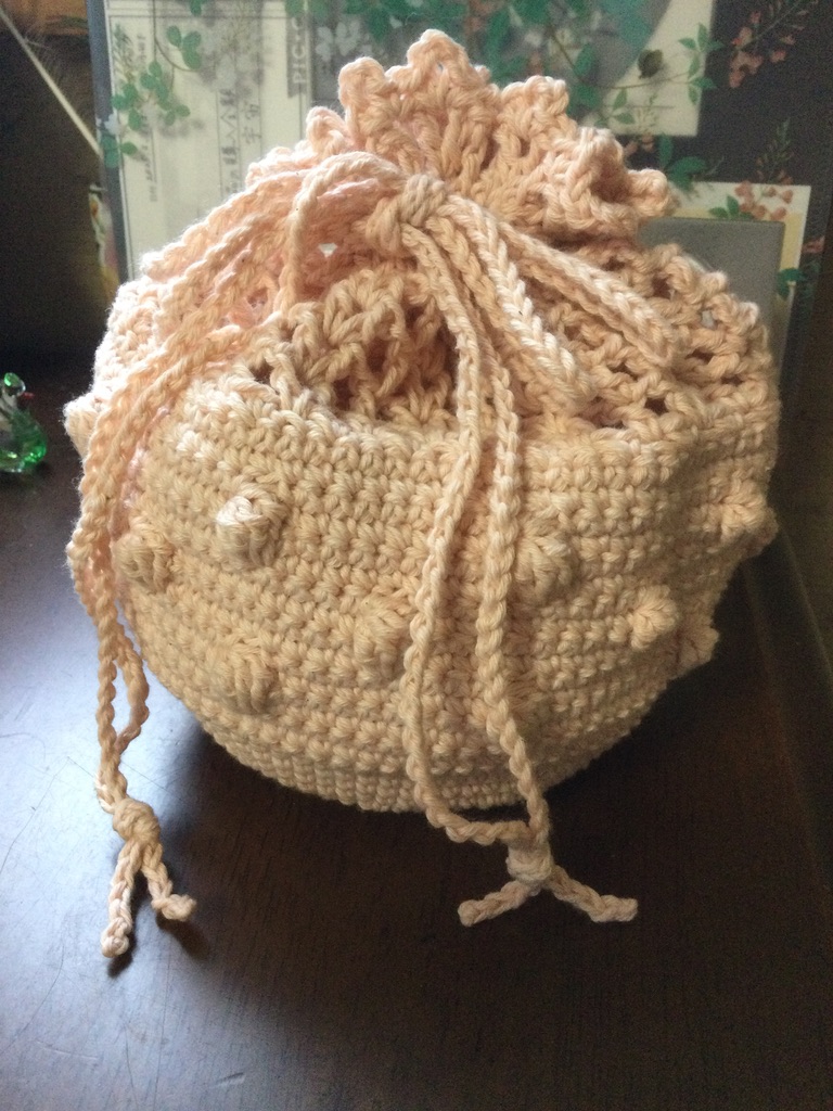 どこから見ても100点満点。ミルクティみたいな淡い灰茶色、玉編みが点々と入った丸みのある形状、口を縛る紐と格子状の編み目、大人女子も大好きな要素を詰め込んだ思わずため息を漏らす可愛さである。しかも、奇跡みたいにちょうど糸が二玉ぴったりで編み上がったんですよ。これもすごい。最後の方は、糸が足りるかなってひやひやしたけど。