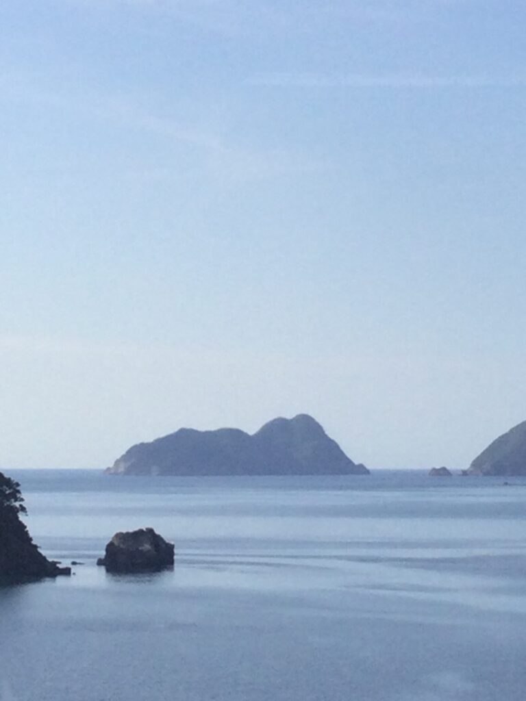 そしてバスは、海辺に出た。福井の海を見るのは初めてだった。洋上の御神島は、神社に描かれた絵と同じ形をしていた。奈良からはるばる福井まで来た。