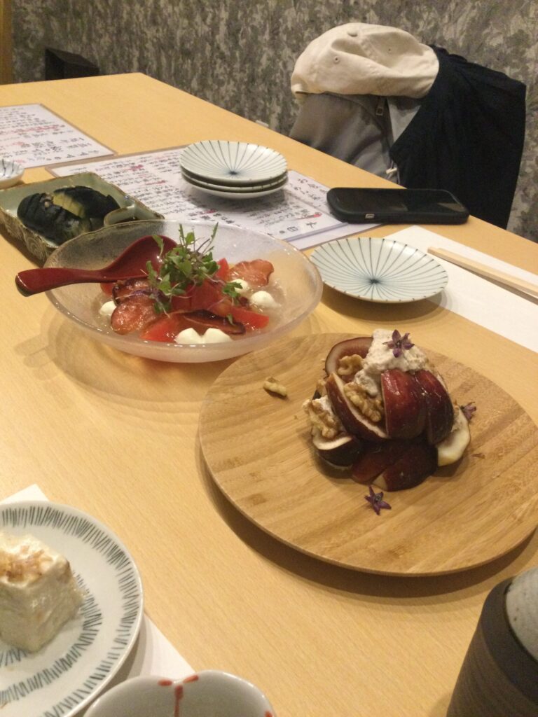 夜は、わたしに丹生の下社のことを教えてくれた女性とわたし達の3人で食事をした。店に入ってから雨は大降りとなり、他に入ってくる客はいない。